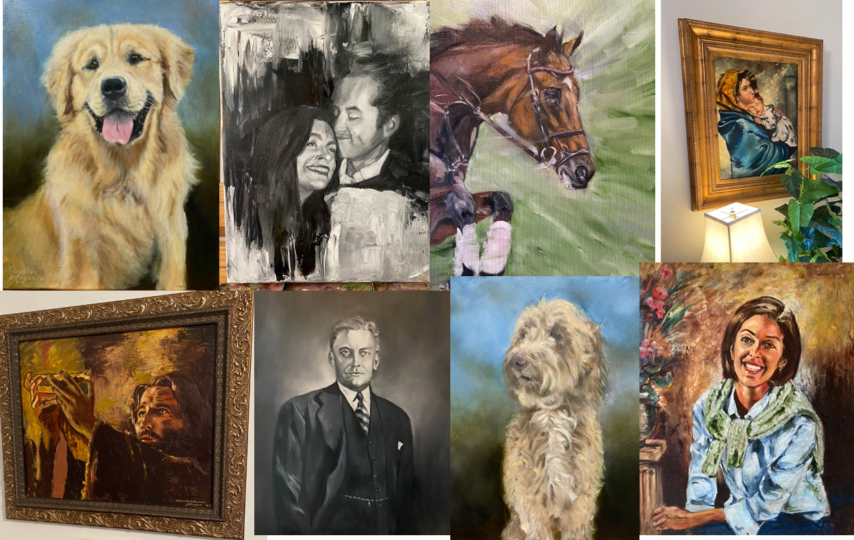 I will paint animals (best at dogs and horses) and humans, and in a head and shoulders format. I work from photographs, yet a brief video of the subject is helpful if available. Most animals are done on 12 x 16 canvas in oil (I only paint in oil), and humans are in 16 x 20, except for special orders. Multiple images are quoted upon request through our email sales@djtportrait.com. Typical animal portraits range from $750 - 1,250 and humans from 1,500 to 5,000 & up. For example, pictured here the two dogs and the horse would be 750, the B&W couple 2,000 and the B&W man in suit was 5,000 (24 x 30), and the young lady would be 2,000. The copy of Feruzzi's Madonna of the Streets is from my personal collection, but a two image portrait like that would be 3,000. Multiple animal images in a single painting would be 1,000 per image. As typical of most commissioned art, 2/3 is required on order and the final third on approval of digital image two weeks prior to delivery. Paintings typically take 6 - 8 weeks for delivery, on stretched canvas...size of final delivery may vary as I sense the overall presentation of the image. I deliver them varnished, which requires a minimum of two weeks and up to several months for the paint to dry to the touch before application, so we will discuss that when I receive your images and assess how thick the paint might be. Note in the shopping cart I have included a 250.00 unit price, so if we require a 1000.00 deposit, I would instruct you to select 250 with a quantity of 4. If you want to secure a slot in my schedule (which is first come, first served), and not wait for the back and forth emails/messages to sort out details, purchase one unit as a reservation (250.00). Once you enter the amount of units (minimum 1 at 250) be sure to immediately go to sales@djtportrait.com and start the discussion of what, how, when...and we will exchange phone numbers and get started.